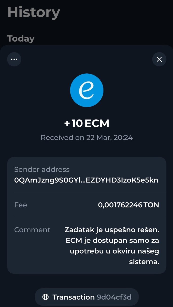 Za izradu ECM e-coin-a izabrana je TON blockchain platforma, koja pruža visok nivo bezbednosti i efikasnosti u transakcijama. TON je brz i ekonomičan, što ga čini idealnim za primenu u obrazovanju.